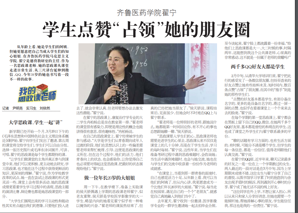 從年齡上看,她是學生們的阿姨,但她更愿意把自己當成大學生們的知心姐姐。在齊魯醫(yī)藥學院馬克思主義學院,翟寧是德育教研室的主任。作為一名思政課老師,她的思政課從課堂走進日常生活,從三尺講臺延伸到微信、QQ,今年39歲的她也書寫著一段不一樣的故事。