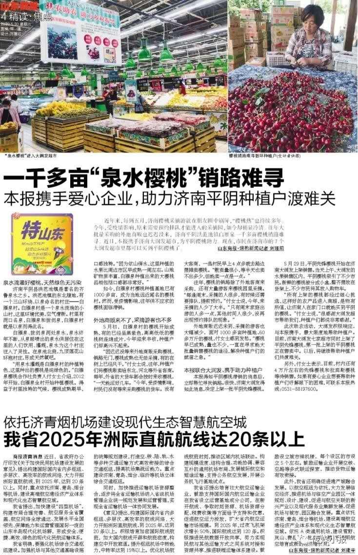 公益助農齊魯行,為愛下單“特山東”。山東商報傾力為扎根齊魯大地的“鄉村好品”代言,為打造鄉村振興的齊魯樣板助力。在由各種平臺得知農戶求助信息并溝通核實后,報社會派出“文字+直播團隊”,利用多個報道和銷售平臺啟動公益助農活動?;顒有问匠恕皫ж浿辈ァ保€包括報紙報道、將產品上架山東商報官方微店等,多管齊下,凸顯合力,為滯銷農產品打開銷路。